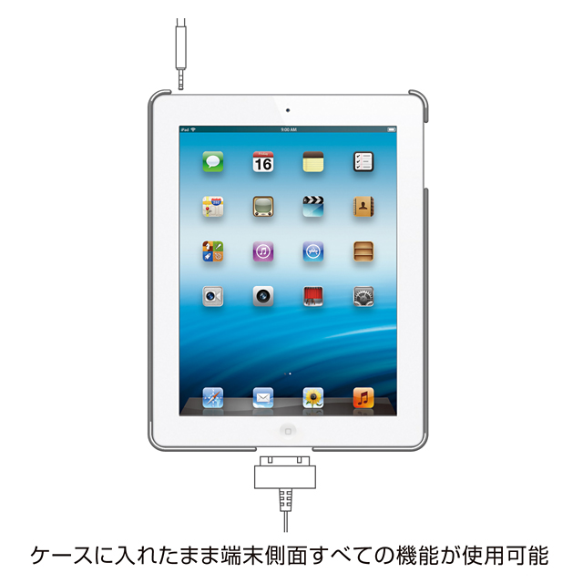 ケースに入れたまま、Dockコネクタへの接続、カメラ、音量調節などiPadのすべての機能が使用できます。