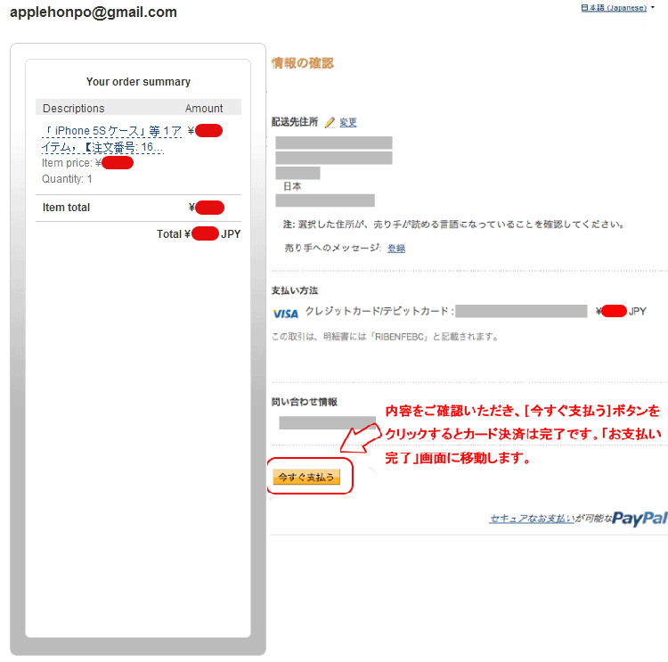 Paypalでの決済が完了しましたら、Paypalより「注文確認メール」が、送信されます。メールボックスをご確認ください。